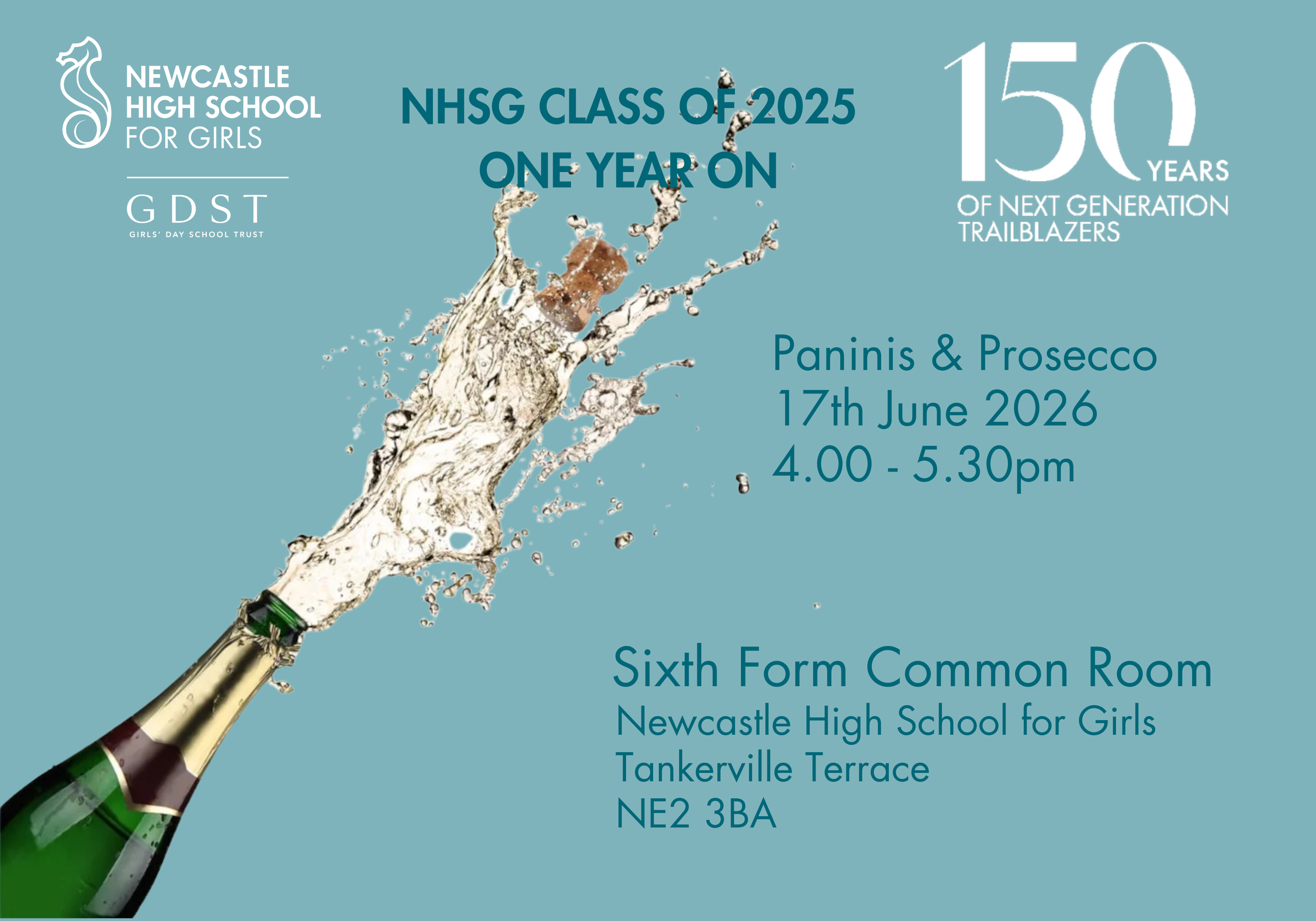 17 June 2026 Free Book nowWelcome back Class of 2025! Join us for paninis and prosecco as you catch up with your classmates on all the exciting things you have been up to since leaving NHSG.