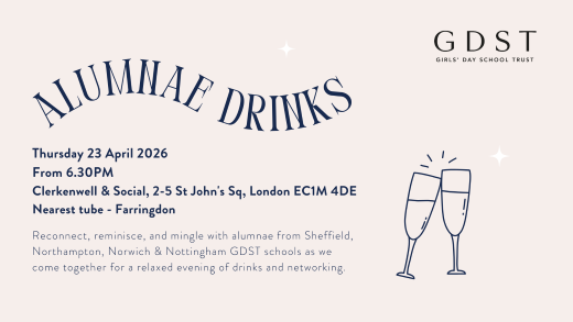23 April 2026 £8.00 Book nowWe are delighted to bring together alumnae from Nottingham Girls' High School, Sheffield High School for Girls, Norwich High School for Girls and Northampton High School for a relaxed evening of drink… Click here for more